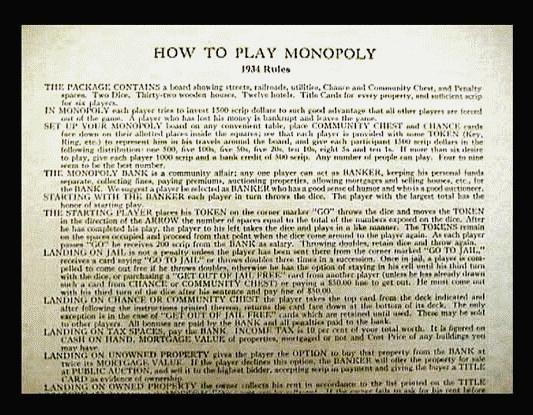 THE PACKAGE CONTAINS a board showing streets, railroads, utilities, Chance and Community Chest, and Penalty spaces. Two Dice. Thrity-two wooden houses. Twelve hotels. Title Cards for every property, and sufficient scrip for six players.